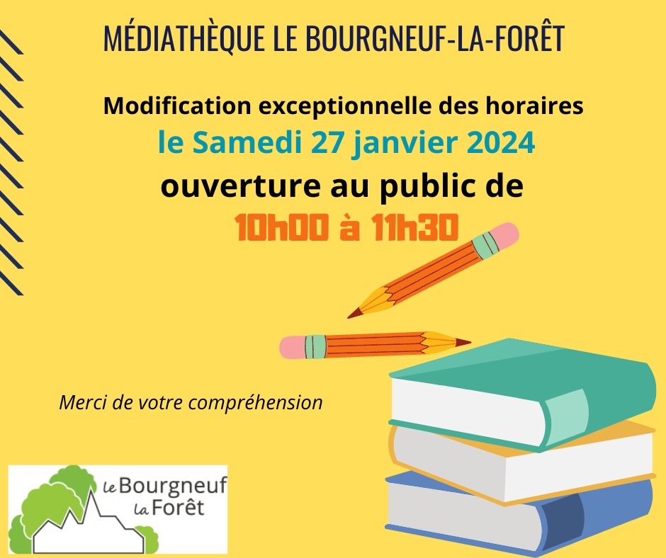 Horaires médiathèque 25 Jan. 2024|Agenda| Partagez cet article, Choisissez votre Plateforme! FacebookXRedditLinkedInWhatsAppTumblrPinterestVkXingEmail