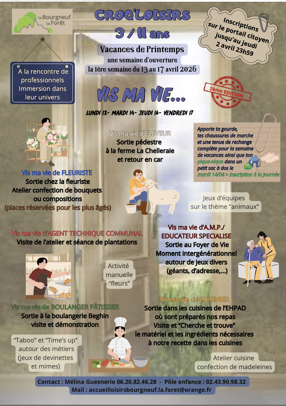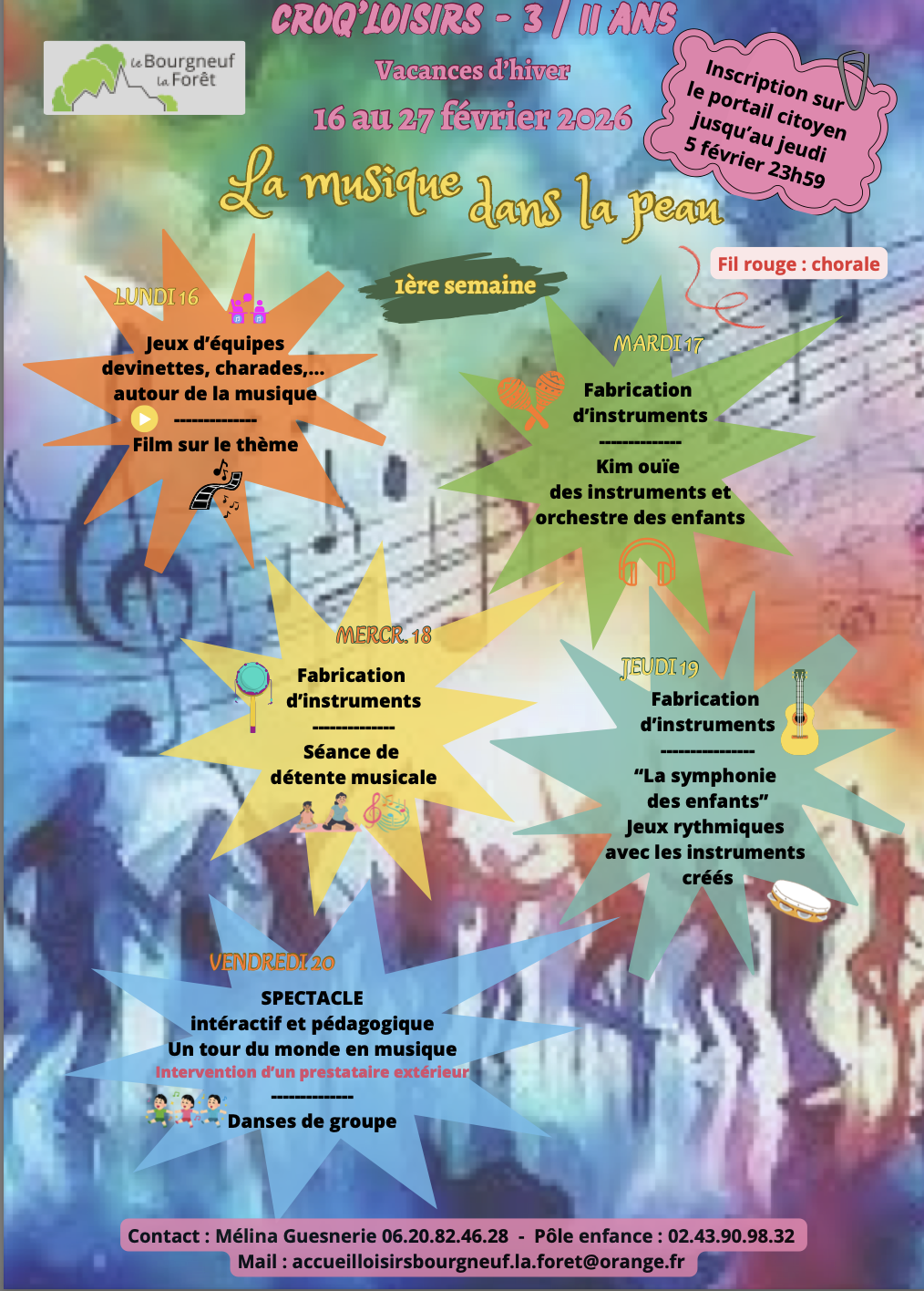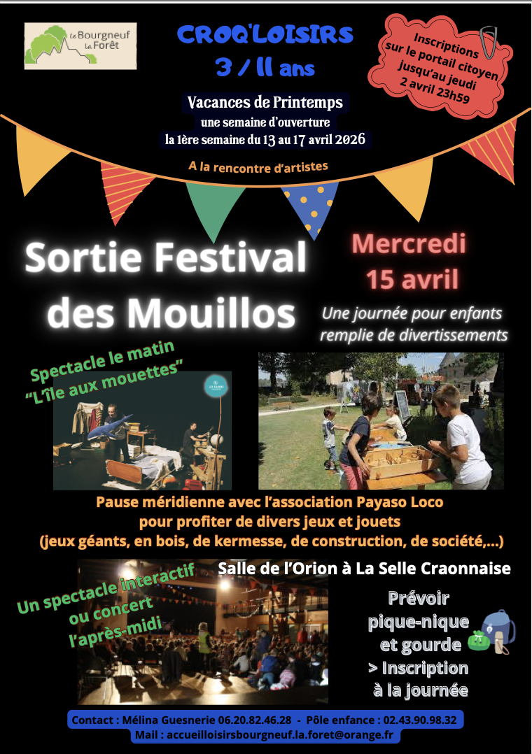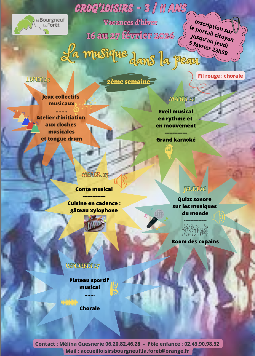 Mélina GUESNERIE au 02.43.90.98.32 ou 06.20.82.46.28 ou accueilloisirsbourgneuf.la.foret@orange.fr