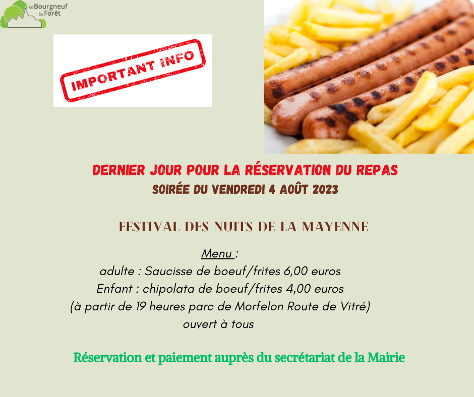 RESERVATION REPAS NUITS DE LA MAYENNE 19 Juil. 2023|Actualités, Agenda| Partagez cet article, Choisissez votre Plateforme! FacebookXRedditLinkedInWhatsAppTumblrPinterestVkXingEmail